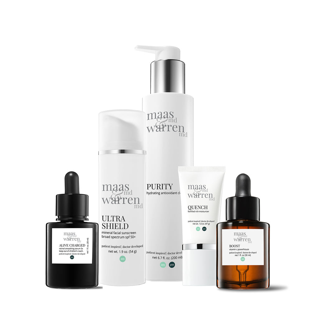 The Maas MD & Warren MD Skincare systems are based upon the rebuilding and strengthening of dermal cells (fibroblasts), the stimulation of collagen production (which firms and promotes skin elasticity), and the addition of the most powerful antioxidants available to help destroy free radicals. These systems have high concentrations of active ingredients, are patient-inspired, and are doctor-developed.